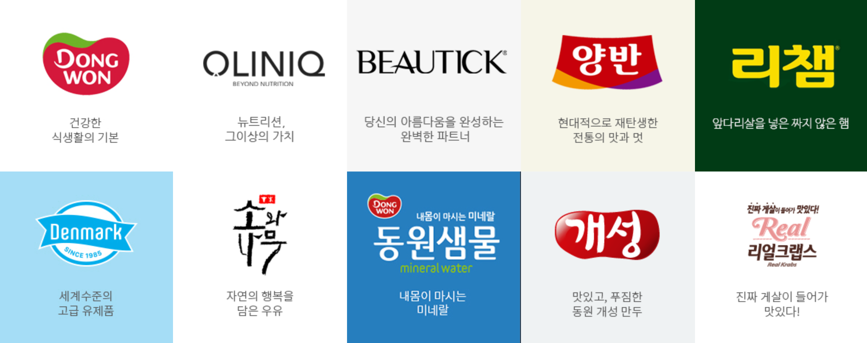 동원참치, 동원 양반김, 동원데어리푸드, 동원홈푸드등이 주 계열사이며 브랜드는 아래와 같습니다