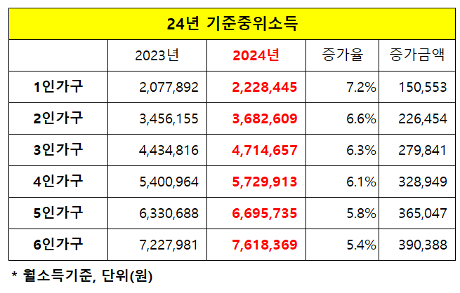 24년 각종 지원금의 지원 기준은 위 표의 중위소득 기준으로 정해지게 됩니다.