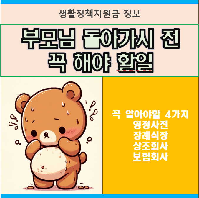 누구도 상황이 닥치지 않으면 말해주지 않기에 부모님 돌아가시기전에 알아야할 사항에 대해서 정리했습니다.
