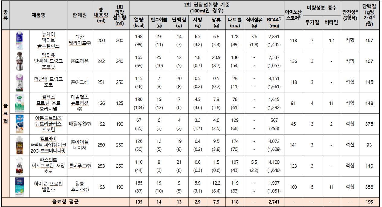 음료형 제품도 제품별 단백질 함량이 4~21g으로 최대 5.3배 차이 나는 것으로 나타났습니다.