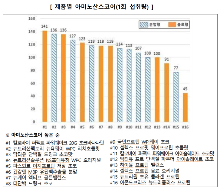 뉴트리션팩토리 뉴욕웨이 WPC 리치초콜릿′(뉴트리션팩토리)의 섭취량이 최대 63g(1일 3회 섭취 시), ‵닥터유 프로 단백질 파우더 아이솔레이트 초코′ (㈜오리온)가 최대 58g(1일 2회 섭취 시)으로 상대적으로 많았다.