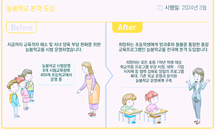 * 초등 1학년 대상 학교적응 프로그램 무상 지원, 대학·기업·지자체 등 협력 강화로 양질의 프로그램 확대, 기존 학교 운영과 분리된 늘봄학교 운영체계 구축