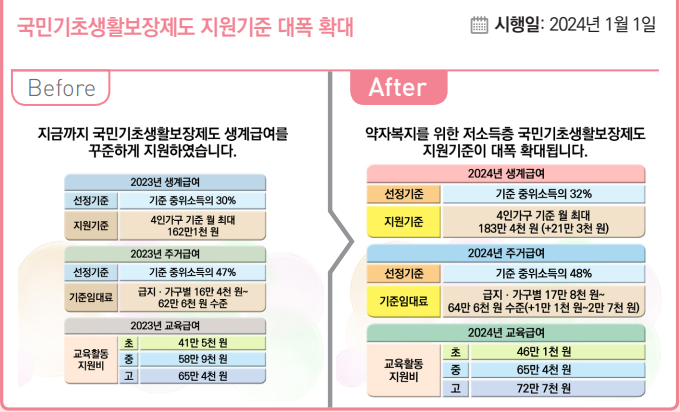 □ 저소득층의 기초생활보장 강화를 위해 생계·주거급여의 선정기준 상향*, 교육활동지원비 인상** 등 국민기초생활보장제도 확대(’24.1.1.)