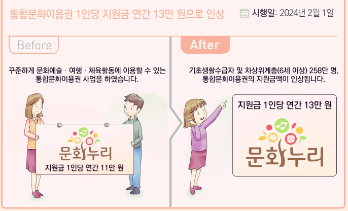 □ 기초생활수급자 및 차상위계층이 문화예술, 여행, 체육활동 등에 이용할 수 있는 ‘통합문화이용권’의 1인당 지원금이 연간 11만원에서 13만원으로 인상(’24.2월)