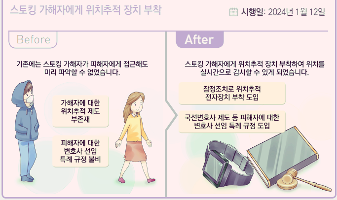 □ 스토킹 가해자의 보복행위를 사전에 차단하고 피해자를 보호하기 위해 잠정조치로 가해자에게 위치추적 전자장치 부착 도입(’24.1.12.)